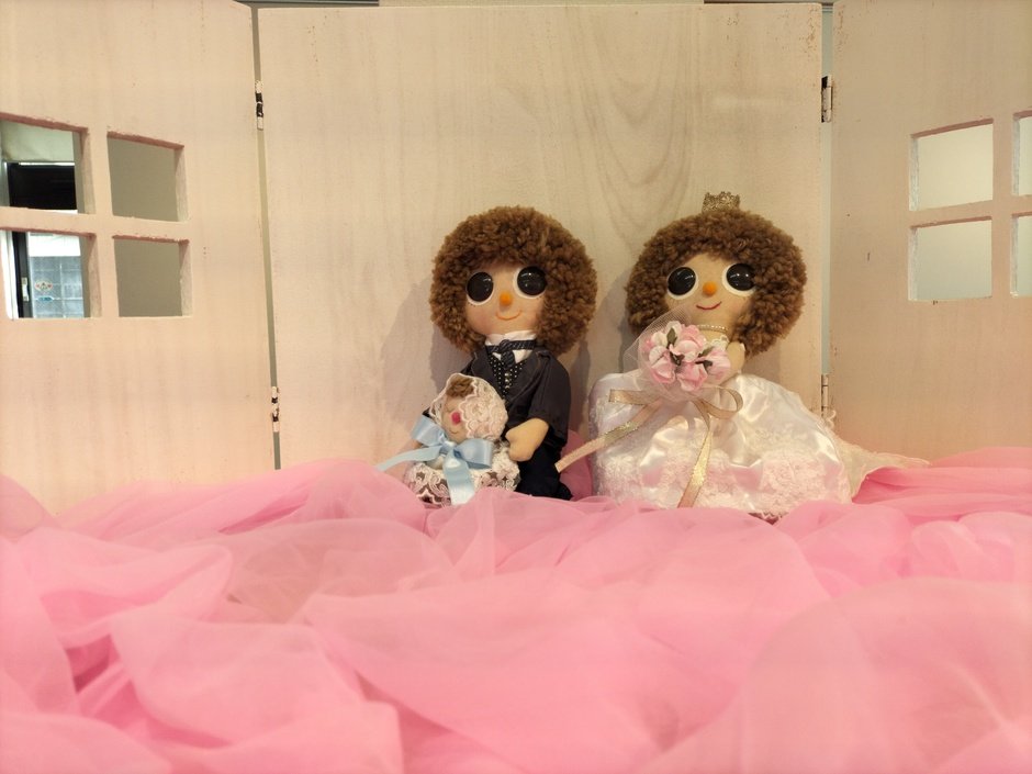 くるくるパーマの髪と大きなくりくりおめめのお人形は、一つとして同じものはなく、見ている人を笑顔にしてくれます。