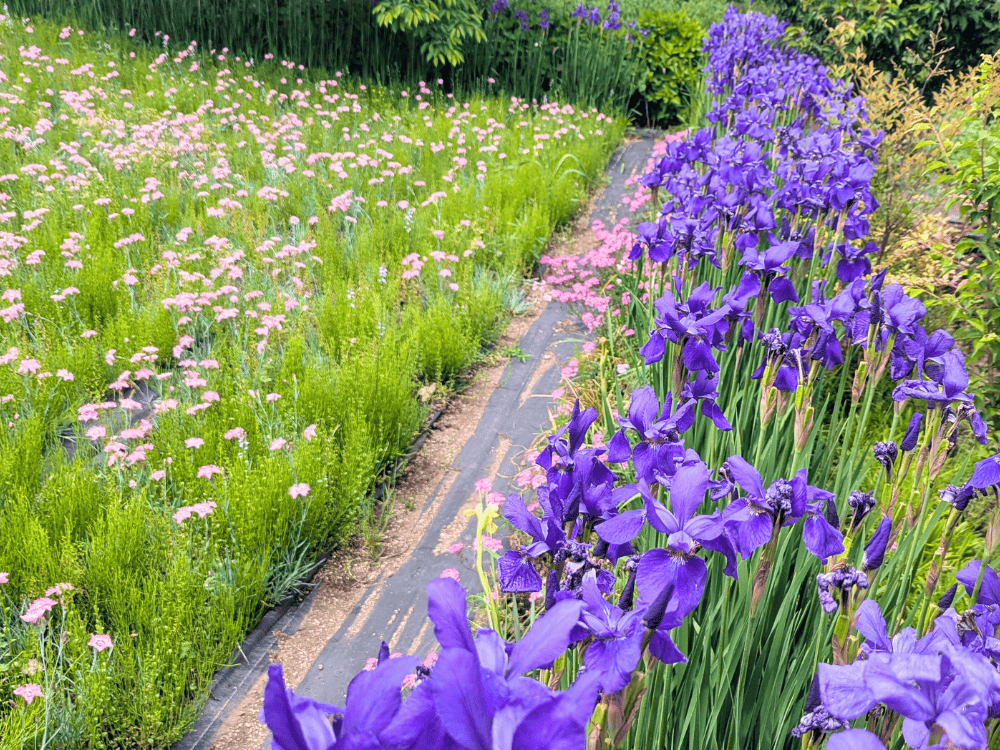 見頃はゴールデンウィーク前後。一角には紫のアヤメも咲き、ピンクとのやさしいコントラストが庭を彩ります。