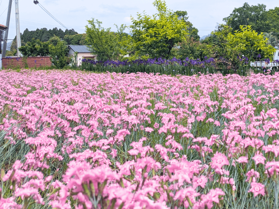黒木さん宅の約13アールの敷地いっぱいに咲き広がるのは、鮮やかなピンクのナデシコ「ライオンロック」。