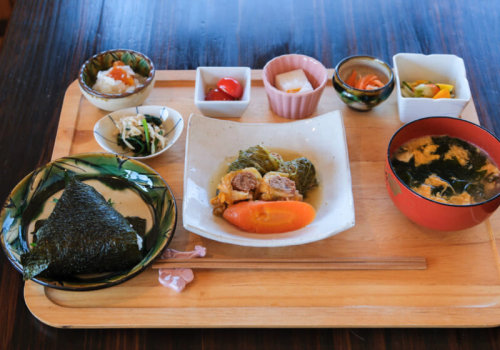 日替わり定食は、メイン料理に、おにぎり1個・汁物・小鉢が付き、季節の食材を使った手づくりのおかずを少しずつ楽しめます。