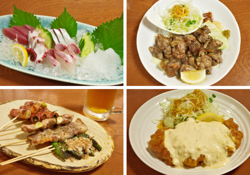 夜は、地どりや串焼き、刺身、焼き物など、多彩な一品料理が揃います。