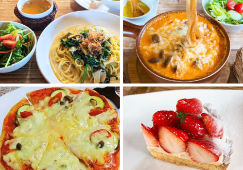 おすすめの「恋花亭ランチ」は、オリーブオイルと岩塩で味わうサラダ、具だくさんスープ、パスタまたはピザ(小)、お好きなケーキとドリンクがセットに。