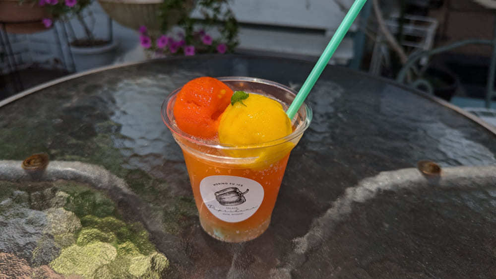 実際に「パプリカーナ」シリーズのパブリソーダをいただきました。ほのかにビターなピーマンの風味と、3種類それぞれマンゴーの割合を変えているというソルベが絶妙でクセになる美味しさです。