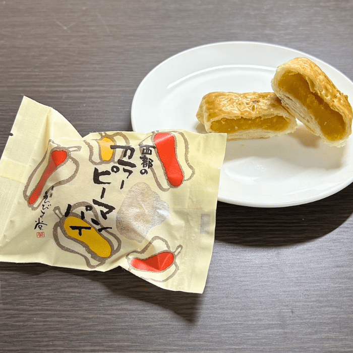 厚みのあるパイ生地と、ほのかに香るカラーピーマン、そして白あんにカラーピーマンを練り込んだ黄色いあんが絶妙なバランスで調和しています。優しい甘みでおいしいです。