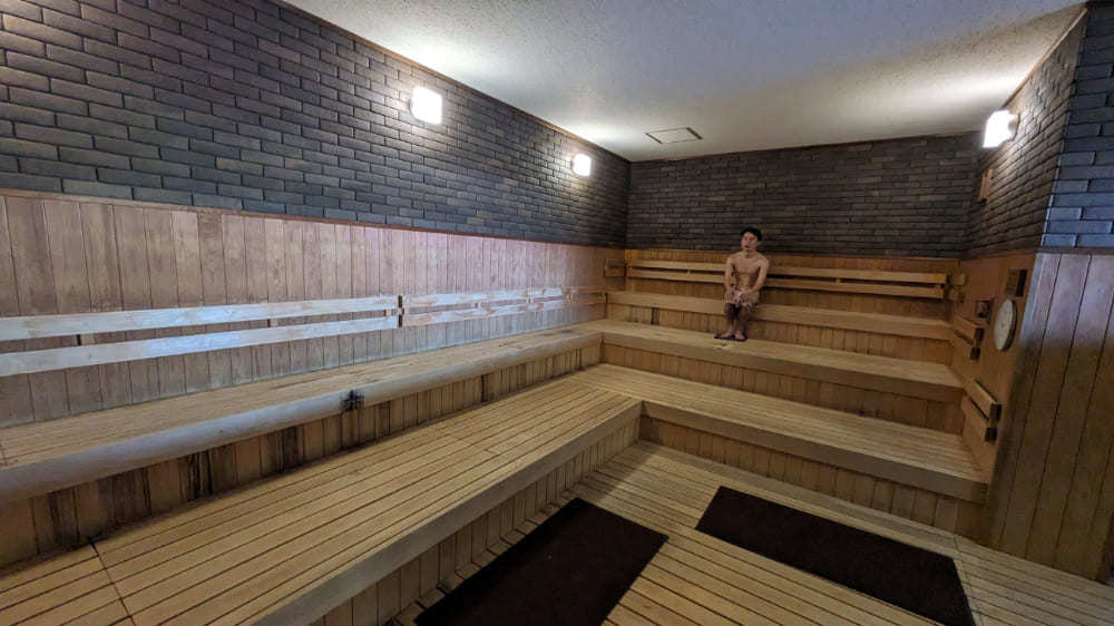 ヒノキが香る広々としたドライサウナがあり、ゆったりとした3段ベンチで20名ほどの利用が可能です。
