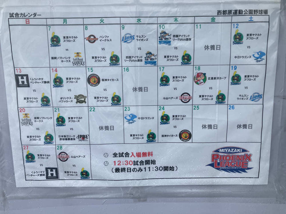 われらが東京ヤクルトスワローズは、西都市の西都原運動公園野球場を本拠地とし連日試合を行います。