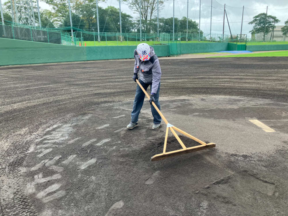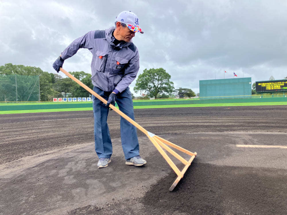 西都原運動公園野球場でもプレーする皆さんがケガなく気持ちよくプレーできるように、できる限り石ころなどがない環境を提供するため、日々業務にあたっています。