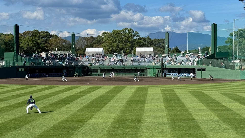 西都原運動公園野球場は、自然の中にあるスタジアムです。コンディションは雨などの自然環境に大きく左右されます。