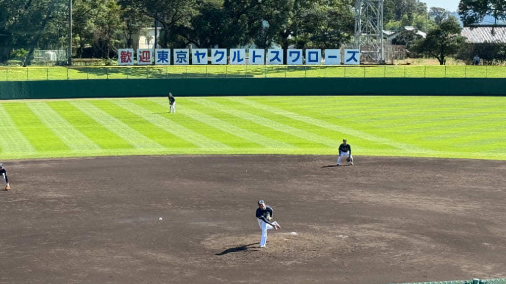 実際に西都原運動公園野球場でプレーする東京ヤクルトスワローズの選手やスタッフに、若き選手の登竜門と呼ばれる「みやざきフェニックス・リーグ」の魅力についてインタビューしてきました!