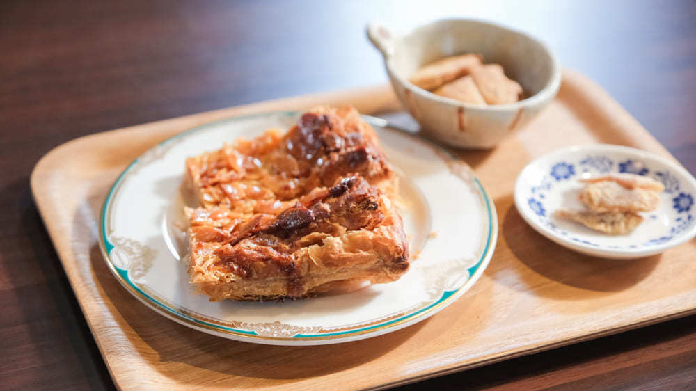 取材時(2025.01.15)のケーキはフロランタンパイ。優しい甘さの生地はサクサクで、紅茶との相性もバッチリでした。