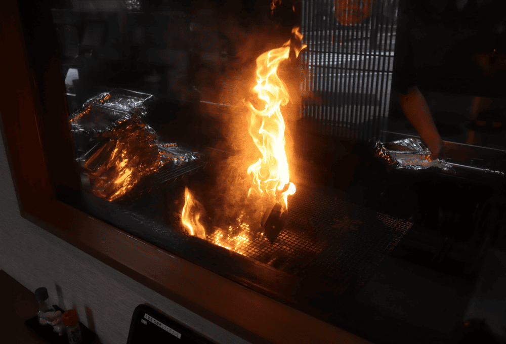 店内は入口正面にカウンター席が。炭火焼を調理する豪快な炎は、ついつい見惚れてしまうほどの大迫力です。