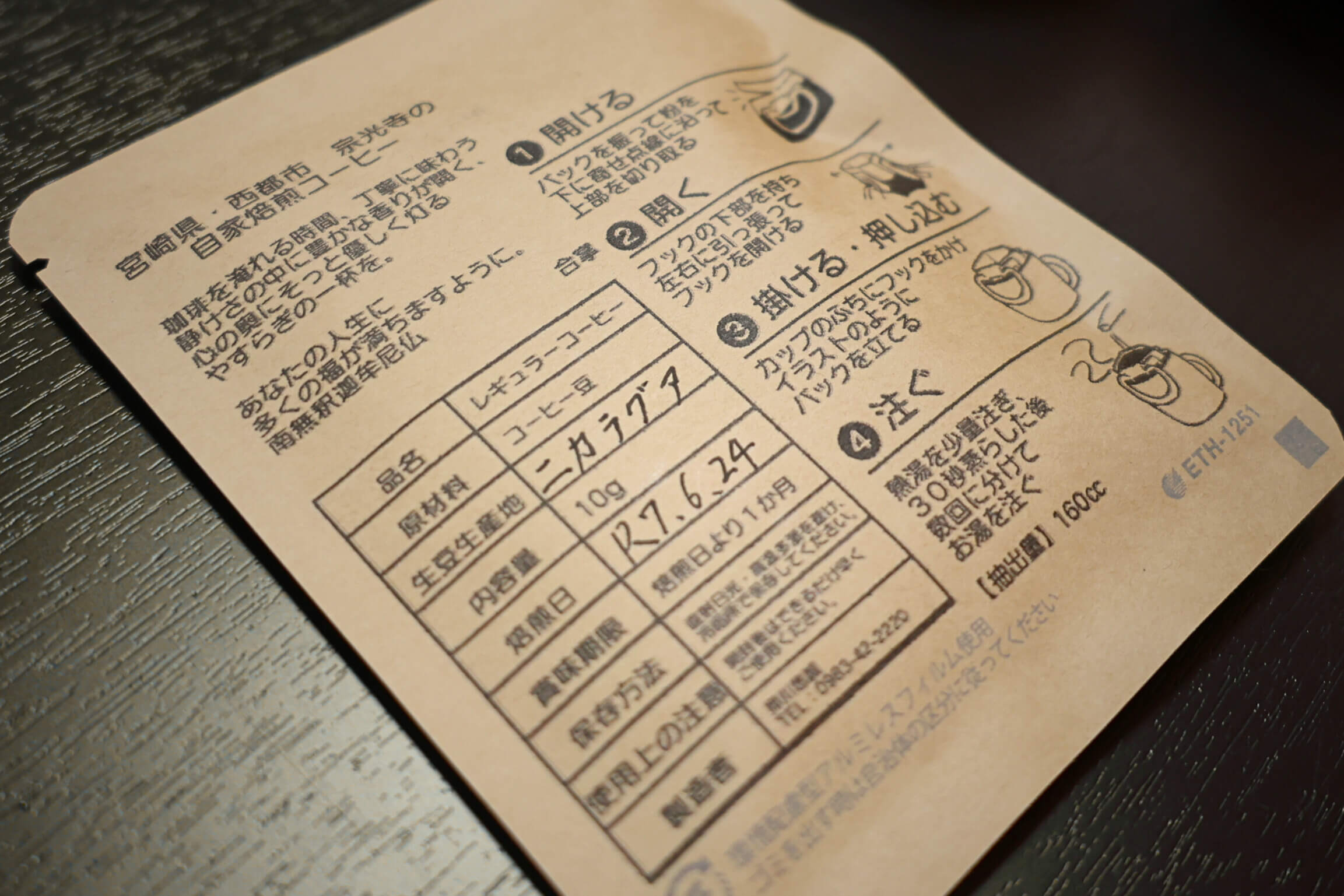 パッケージのイラストは東京にいる先輩へ頼んでいるが、それ以外はすべて自作。「今はこうした資材も簡単に手に入るので、ネット通販で資材を買って、豆を挽いて、パックに詰めて…。パックの裏の製品表示シールも見よう見まねで制作したんです。形になると楽しいですよね」
