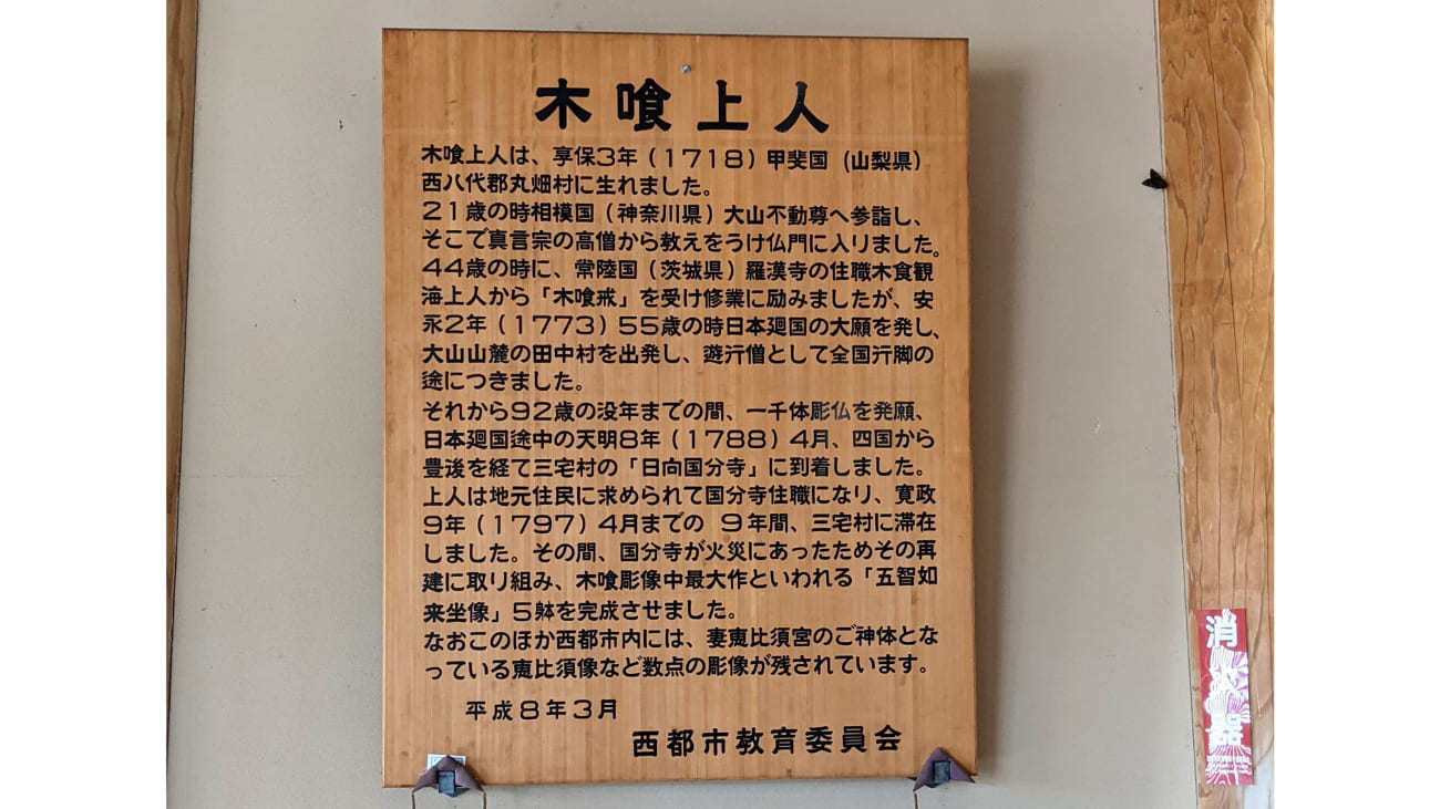 56歳の1773年(安永2年)からの遊行僧として全国行脚に出たといいます。その後71歳の1788年(天明8年)に宮崎に入り、1797年(寛政9年)まで日向国分寺の住職なり、日向国分寺を中心にして日向各地を巡鍚(じゅんしゃく)し、木彫仏を残したそうです。