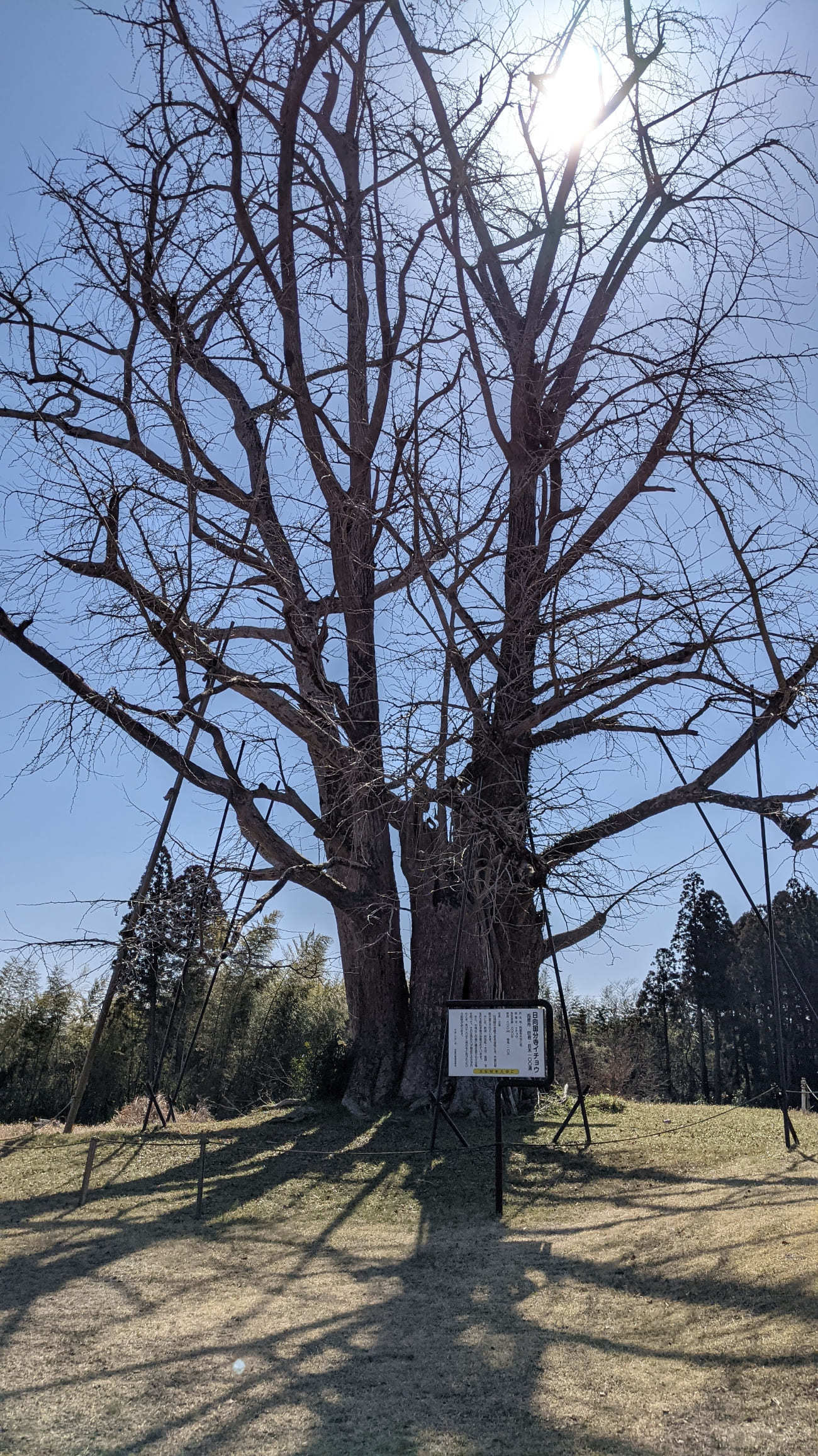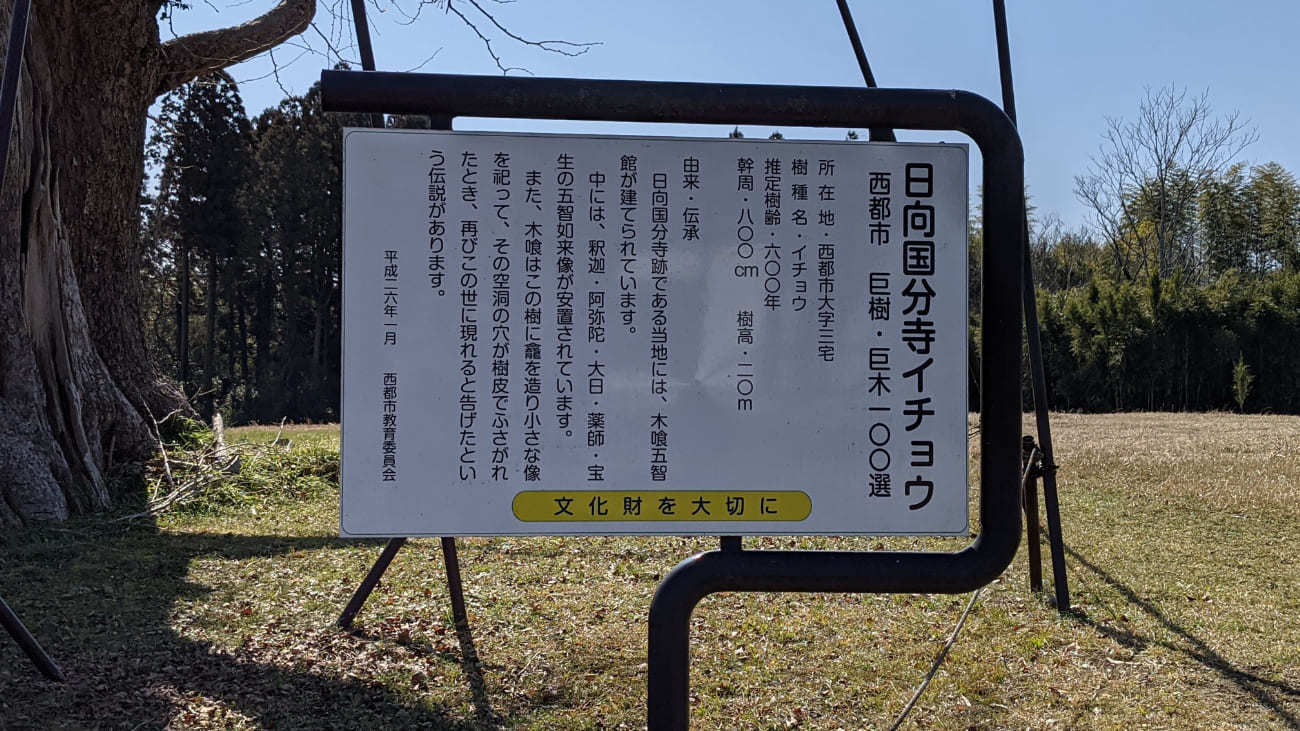 日向国分寺跡に着いてまず目に行くのがイチョウの巨木。ものすごい迫力があります。推定樹齢は600年。幹周は800㎝。樹高は20m。