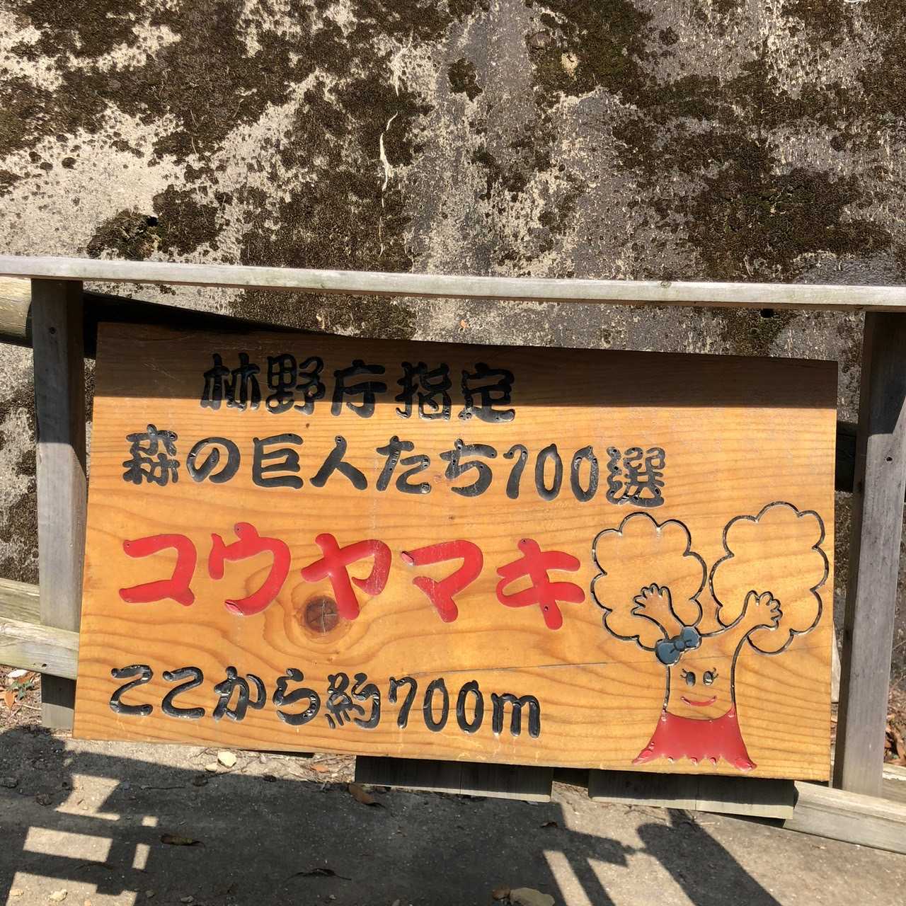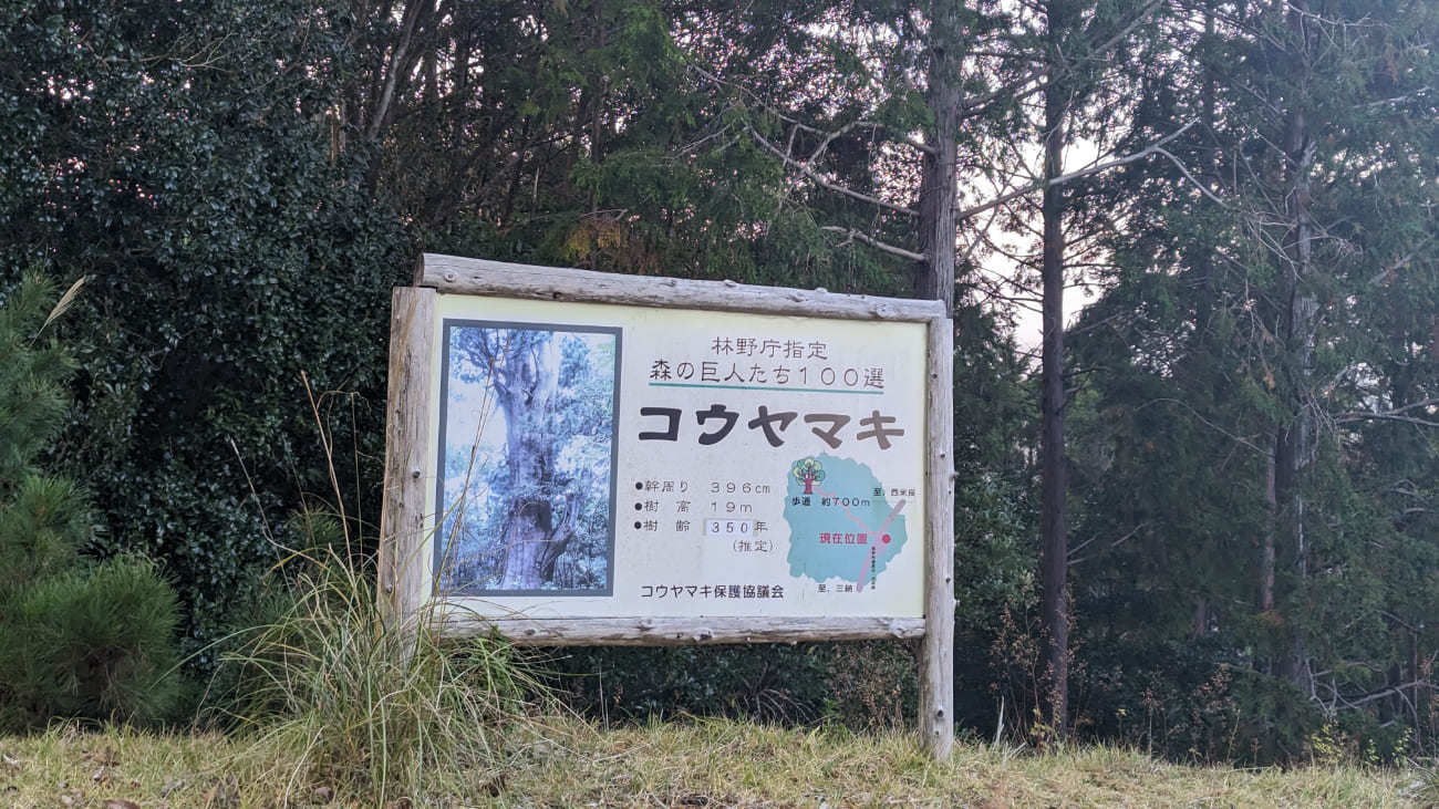 コウヤマキ入口にある看板から、さらに20分ほど山を登ると三納・吹山のマキちゃんに出会えるそうです。