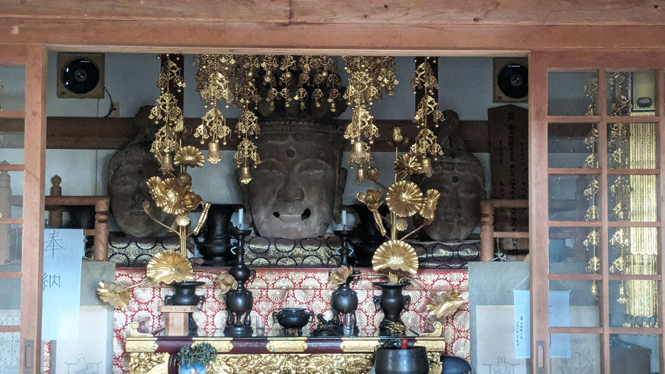 しかし、昭和20年の枕崎台風で建物とともに倒壊し、三尊の頭部・体部・手足部が散逸。現在は頭部のみが観音堂に安置され、仏体部分は解体状態で保存されています。