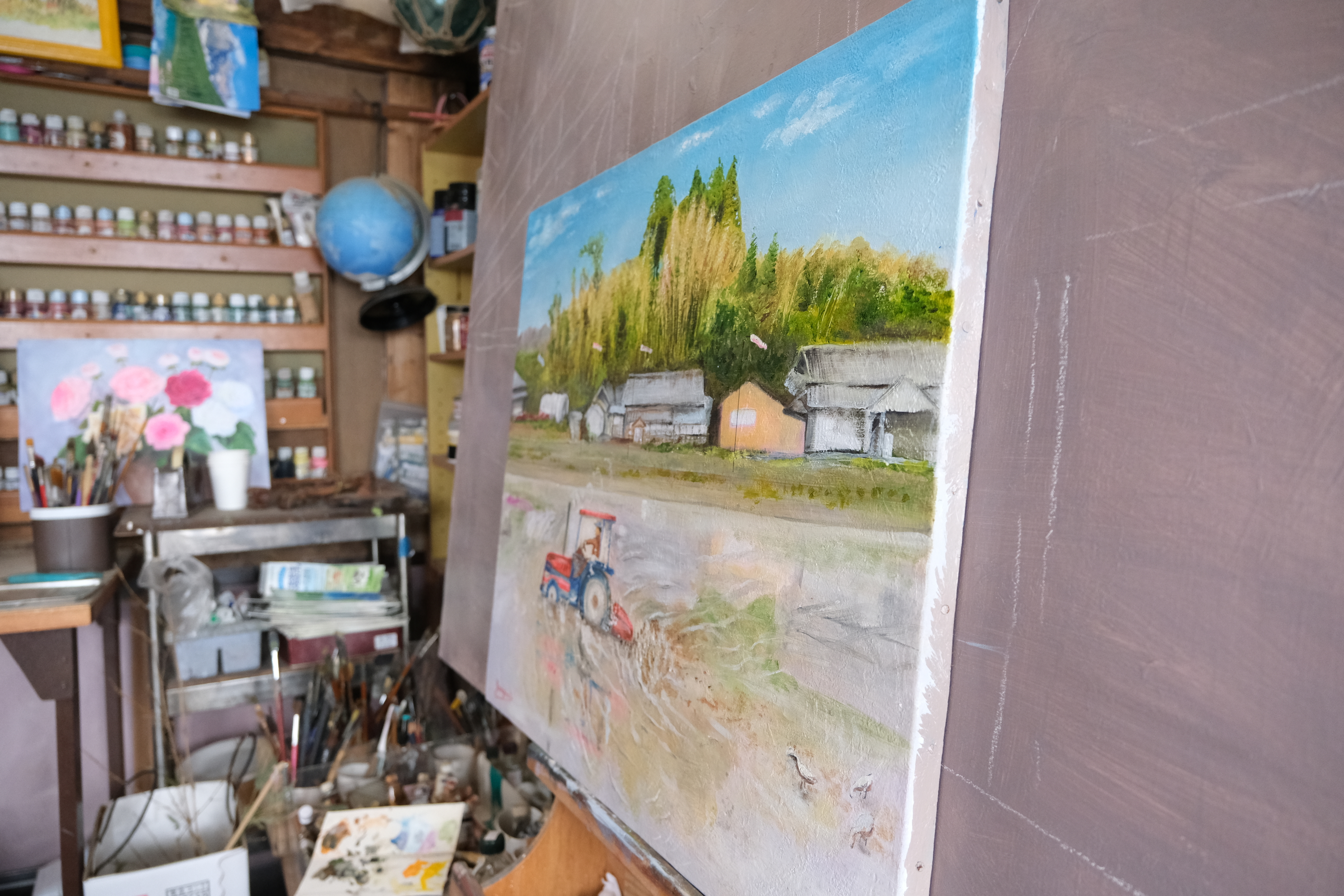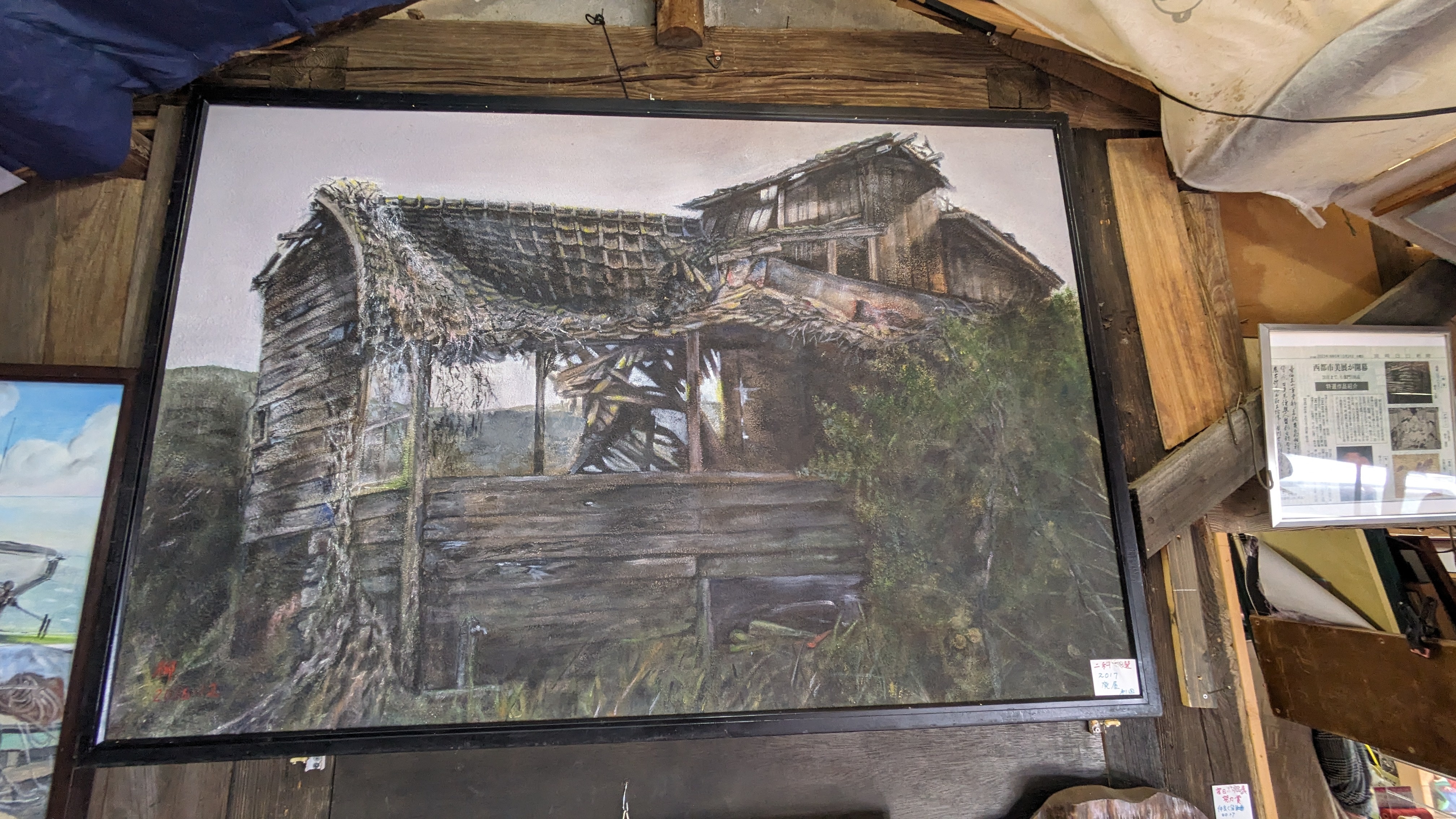 絵画教室で描いているという色鮮やかな作品とは対照的に落ち着いたトーンで描かれている廃屋をテーマにした作品も多数展示されています。