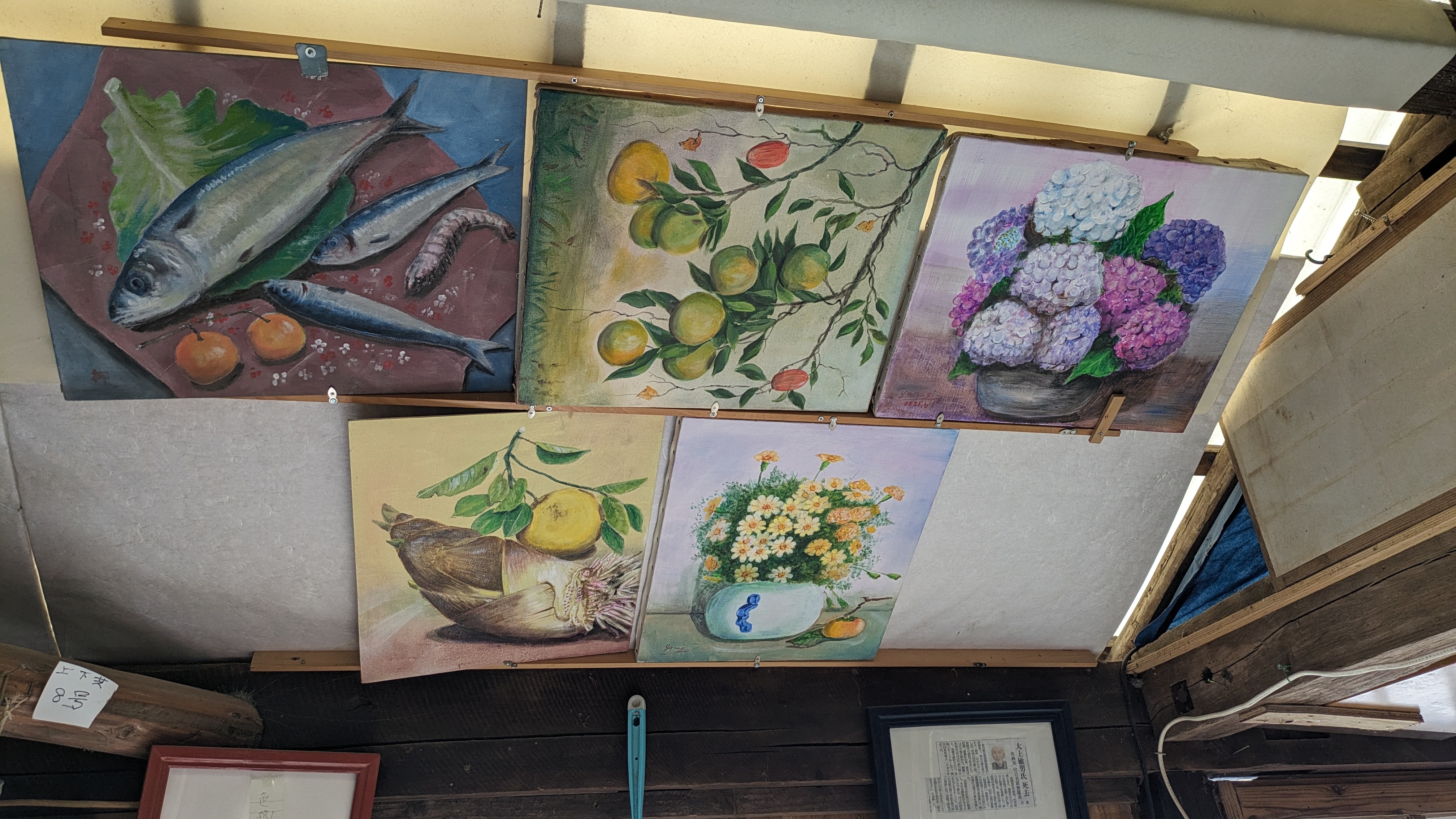 現在も奥様と絵画教室に通われているということで、絵画教室で描かれた自身の作品と奥様の作品も展示されています。花を描いた奥様の作品もすごく上手ですね。