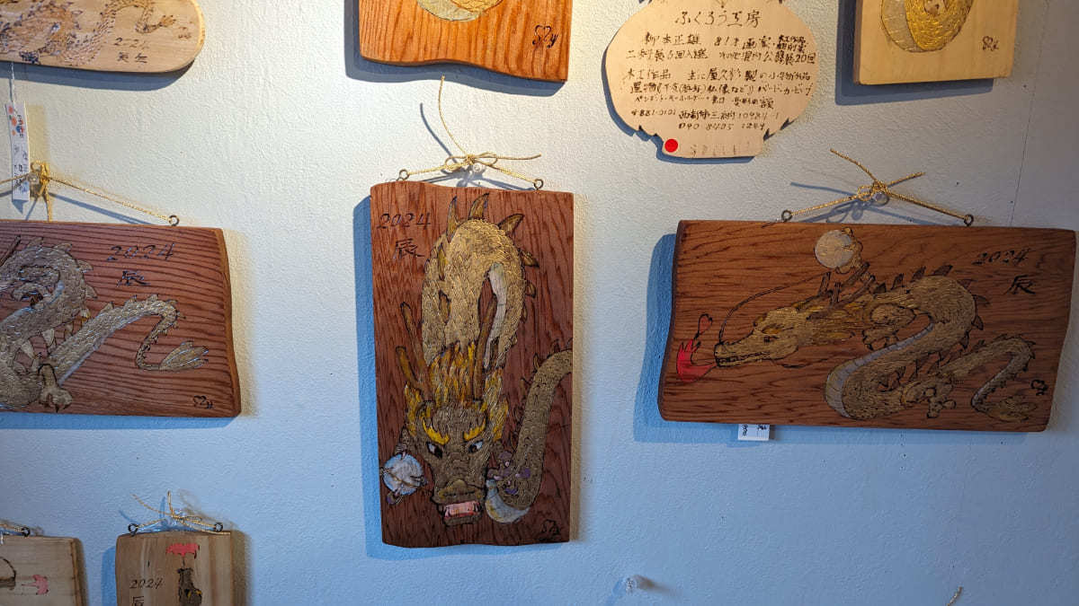 こちらも柳本さんの作品。木工品に辰の画が力強く描かれています。