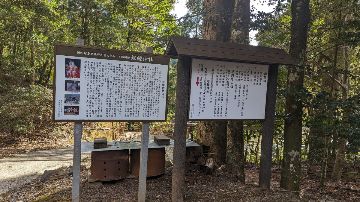 案内をしていただいたのは、東米良創生会の藤内さんと銀鏡神社の宮司の上米良さん。今回は銀鏡神社を中心に案内していただきました。