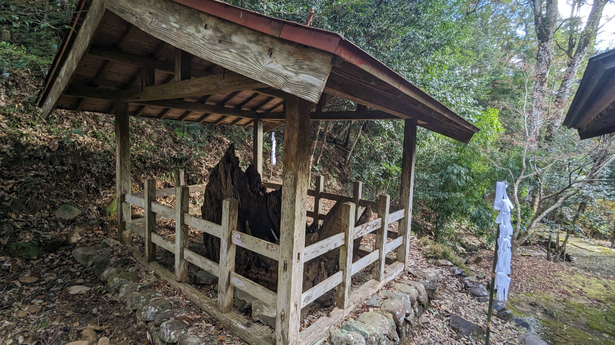 幣拝殿 の奥に本殿があり、そのさらに奥には倒れてしまった御神木の根株が祀られています。