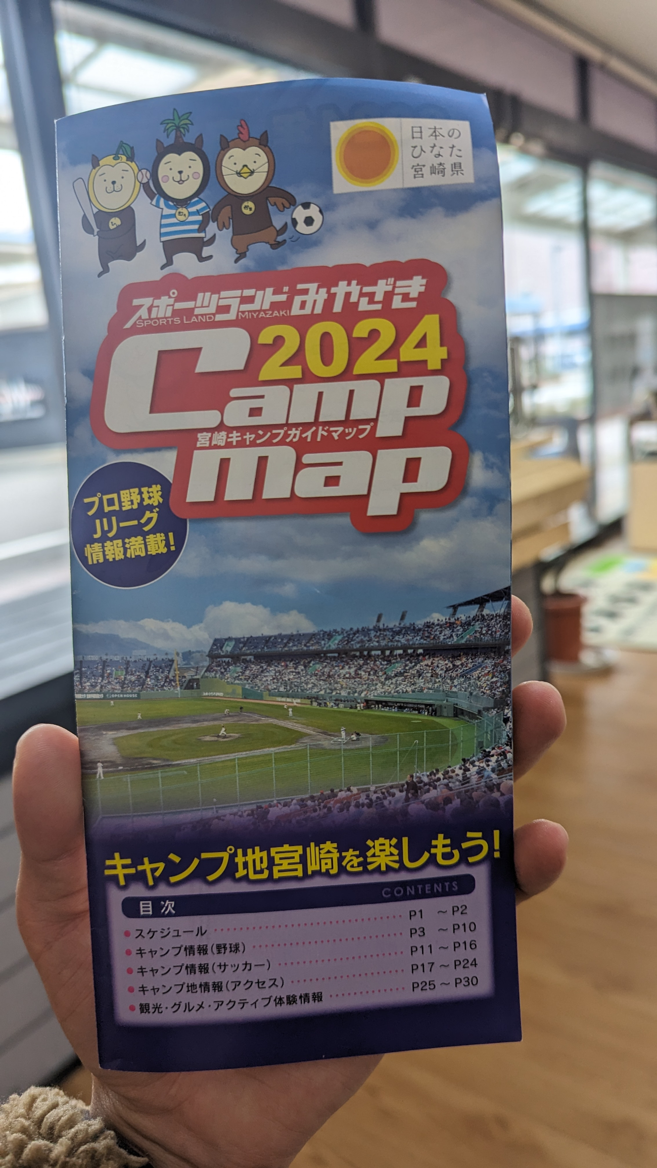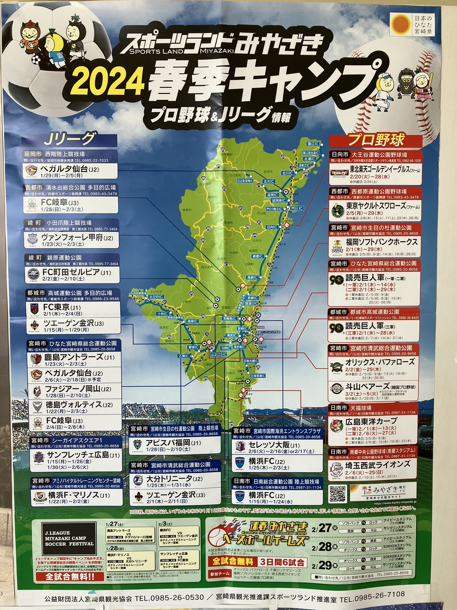 宮崎県観光協会が発行する「宮崎キャンプガイドマップ」を見ると、どのチームがどこでいつからいつまでキャンプをやっているかが丸わかり。