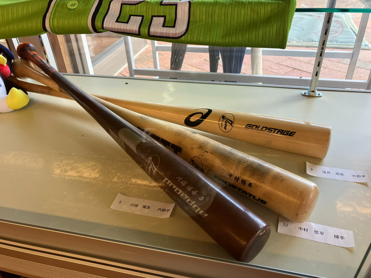 東京ヤクルトスワローズで活躍する有名選手の実際に使用したバットが展示されています。