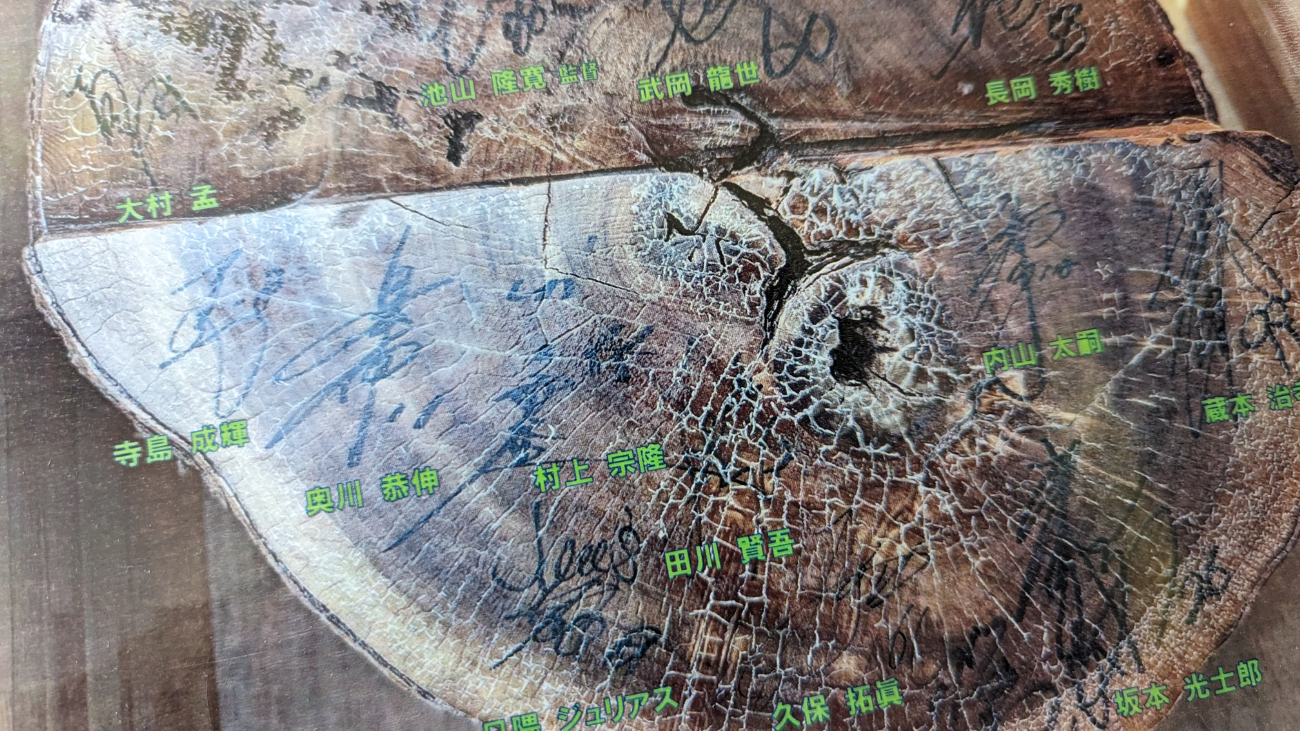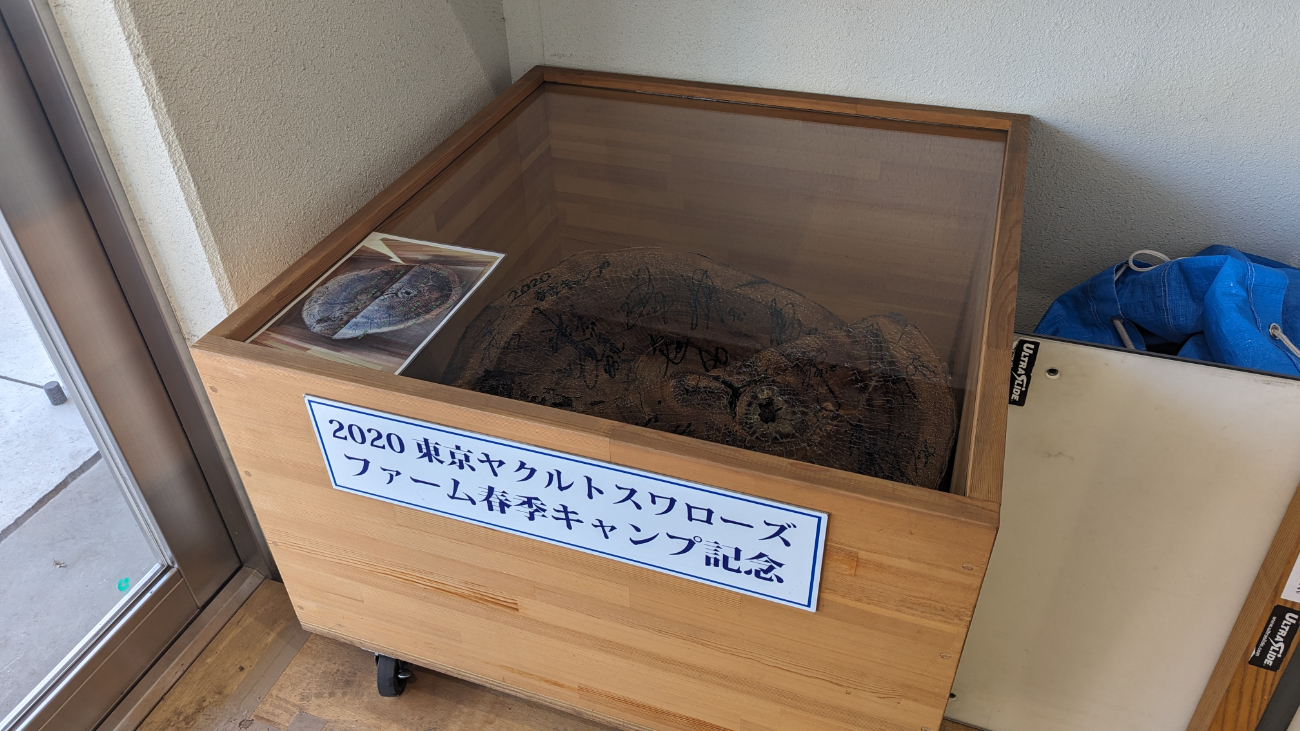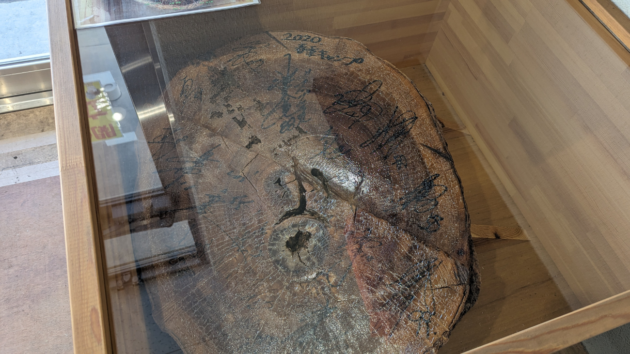 これは、2020年 東京ヤクルトスワローズ 春季キャンプ記念で作られたもので、切り株にその際来ていたヤクルト選手の直筆サインが施されています。