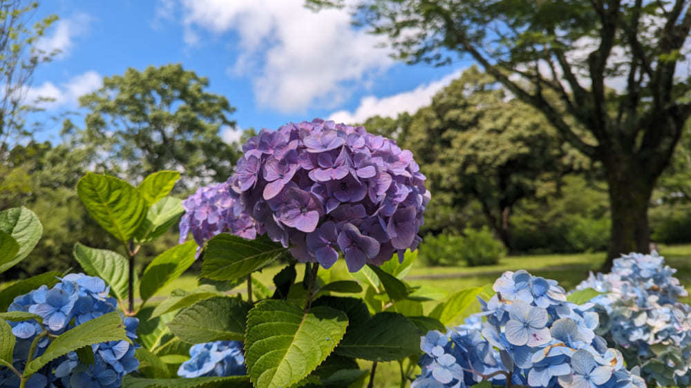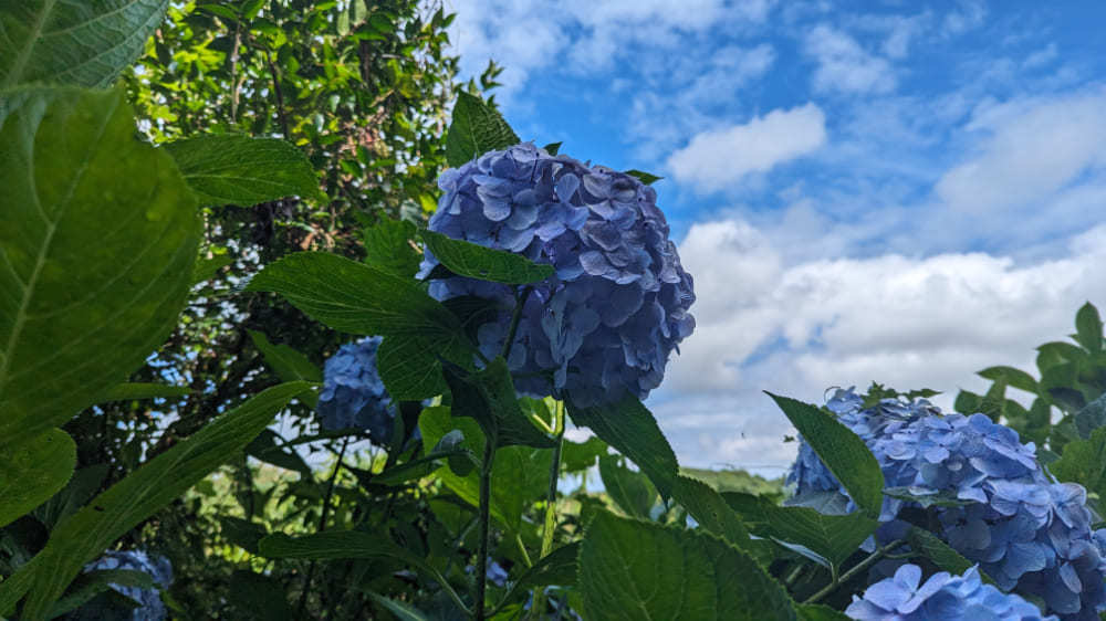 雨上がりの紫陽花は空とのコントラストが合い、より美しく見えます。