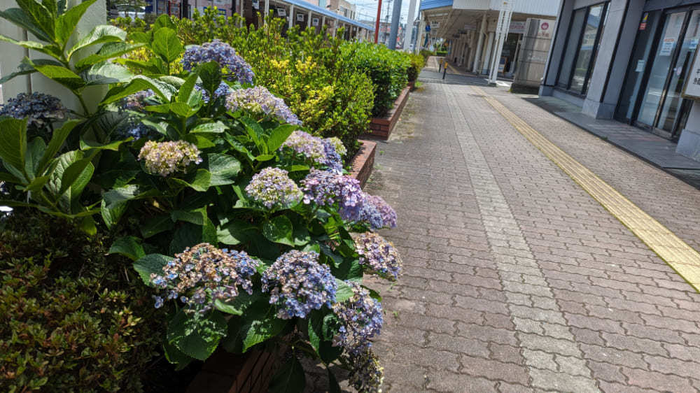 商店街の通りには美しく手入れされた花壇があり、そこに紫陽花が植えられています。
