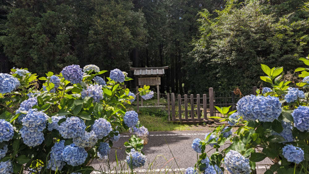 神社のすぐ横には美しい青色や紫色の紫陽花が咲いており、参拝客を楽しませてくれます。