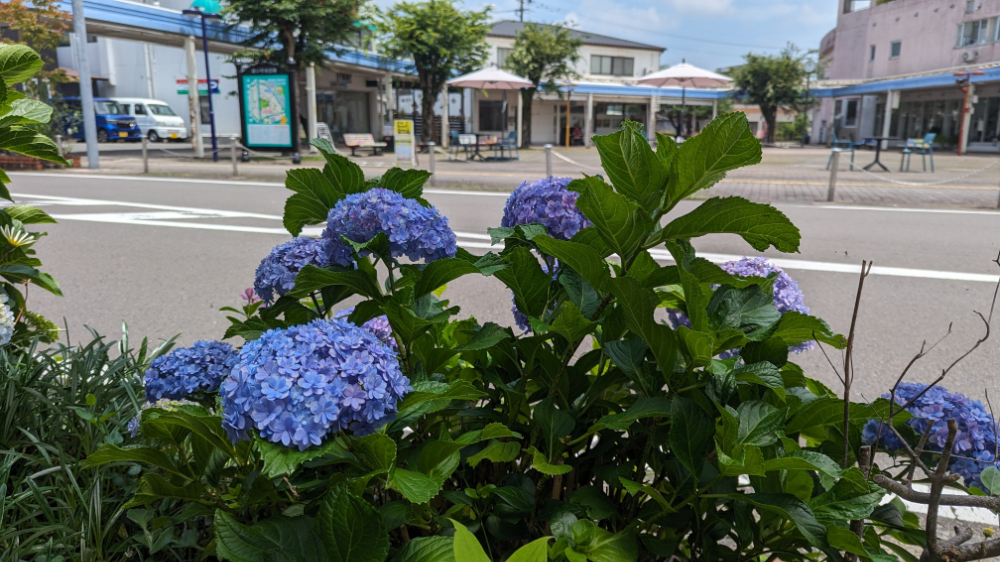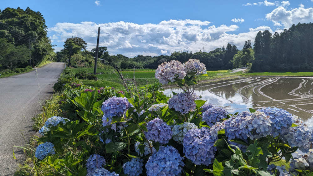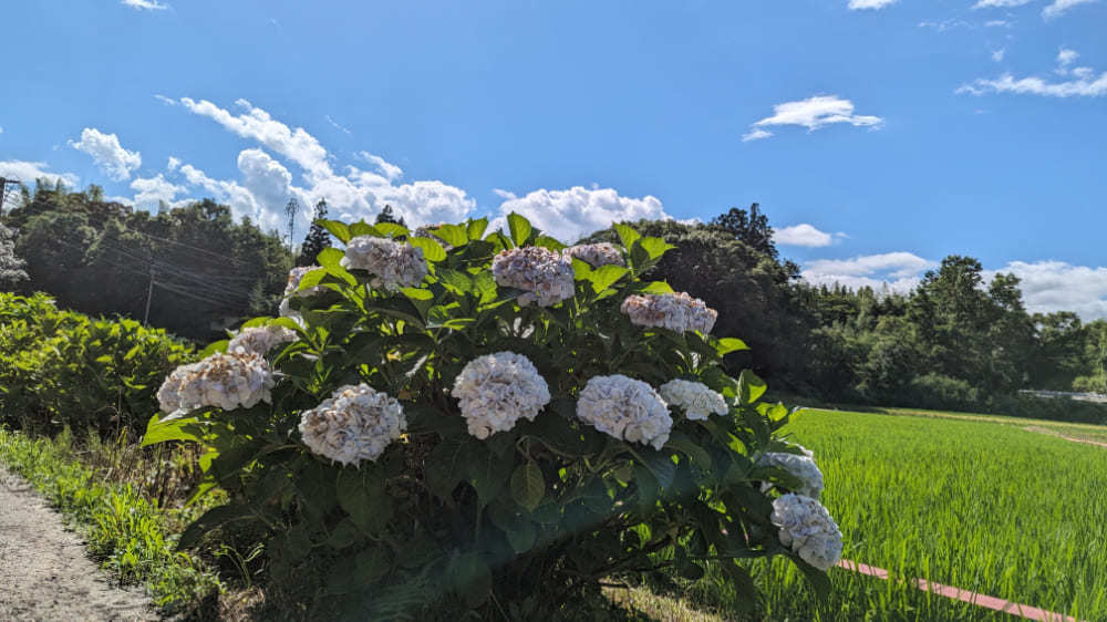 三納の田舎道を歩いていると、緑豊かな田園風景の中にひっそりと咲く紫陽花をたまたま見つけました。