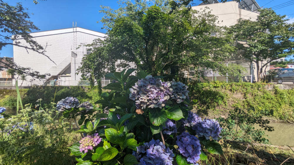 小野崎商店街から少し歩くと都萬神社にかけて流れる桜川沿いにも、紫陽花が咲いてました。