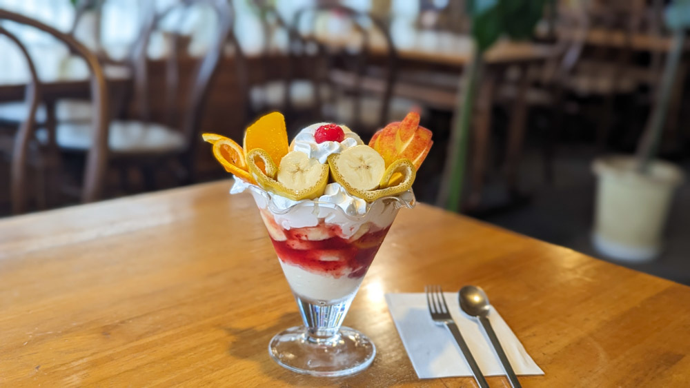 フルーツパフェはバナナ、りんご、オレンジ、チェリーとたくさんの果物が乗っている目でも楽しめるデザートです。
