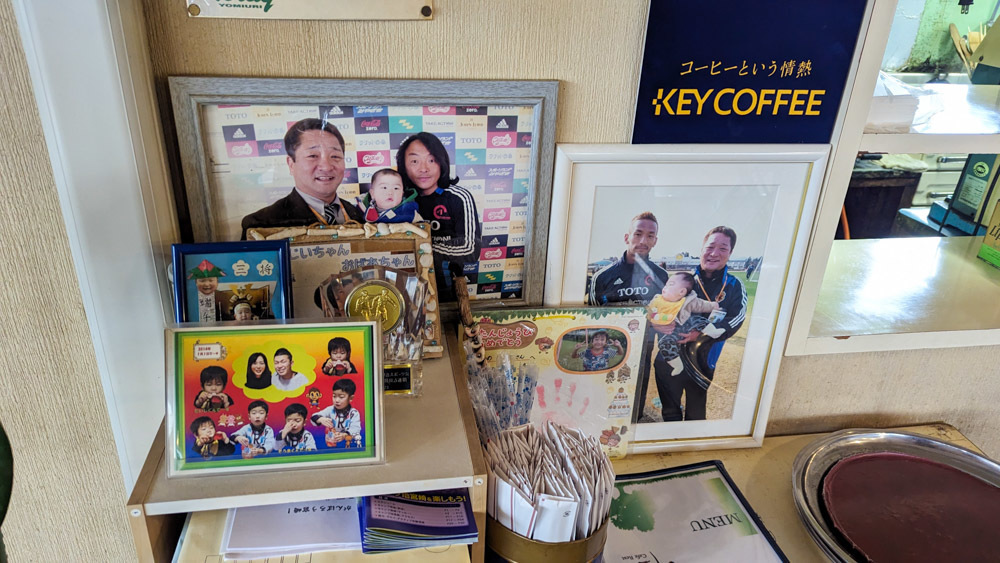 「カフェレスト樹」の店内には、サッカー界のレジェンドたちの写真やサイン、ユニフォームなどが飾ってあり、サッカーファンにはたまらない空間となっています。