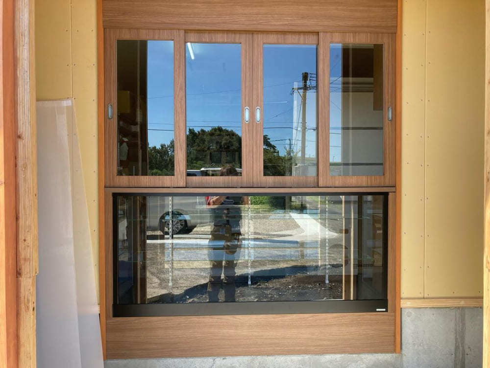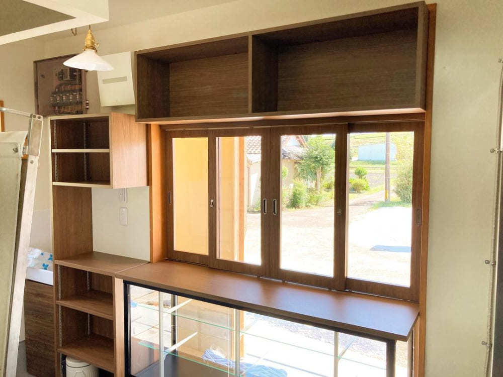 茶臼原のパン屋さん「茶臼原ベーカリー」のレジ台、収納棚、引き戸も製作。