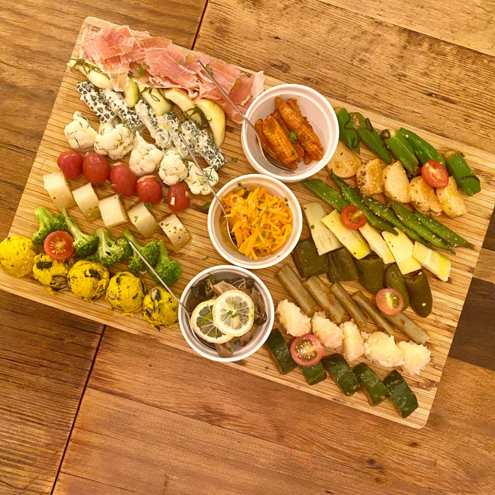 夜のメニューにも、アリパカならではのこだわりが詰まっています。なかでも前菜の盛り合わせは、季節ごとに野菜の種類や味付けが変わる特別な一品。