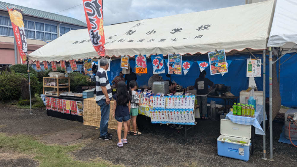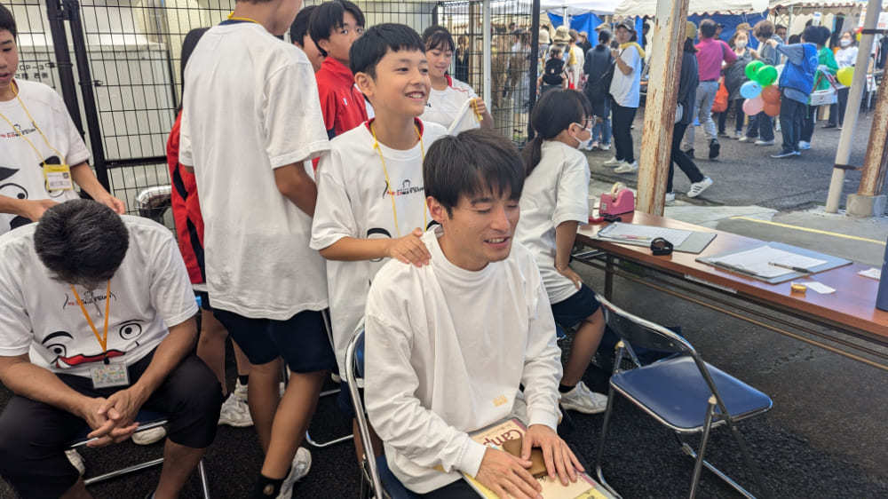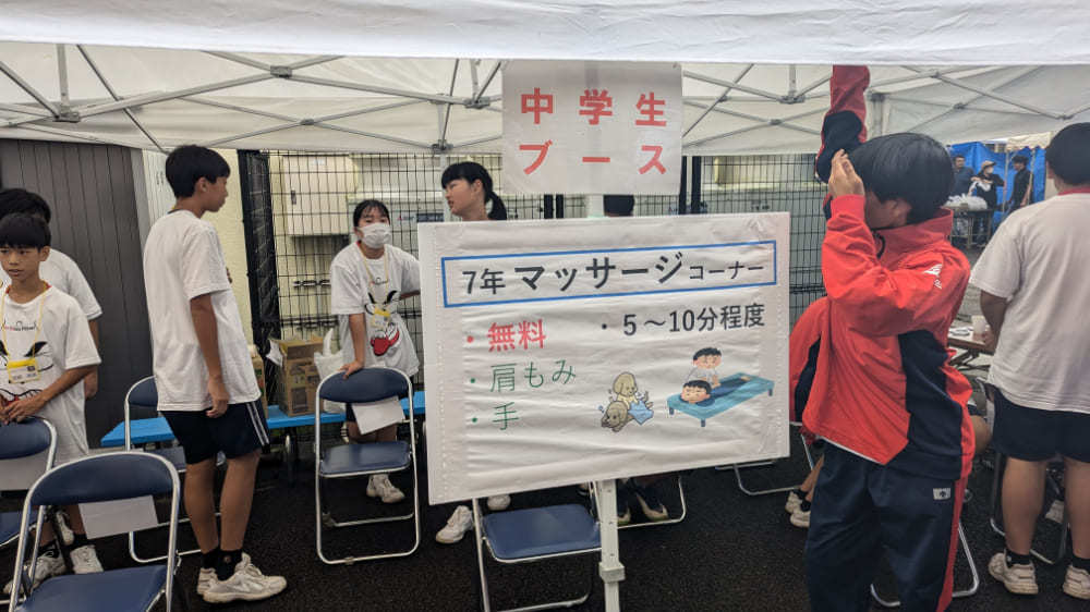 興味津々でマッサージ会場に向かうと、そこにはお祭りの会場にもなっている「三財小中学校」の中学生たちが運営する活気あふれるブースが!