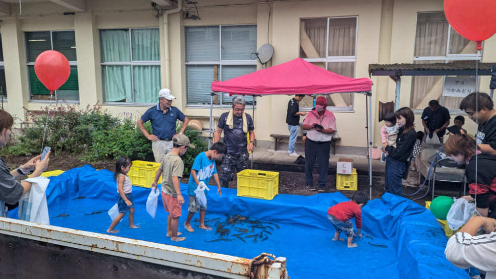 会場の一角には大人気の「アユのつかみ取り」コーナーが設けられ、多くの子どもたちが歓声を上げながら楽しんでいました。