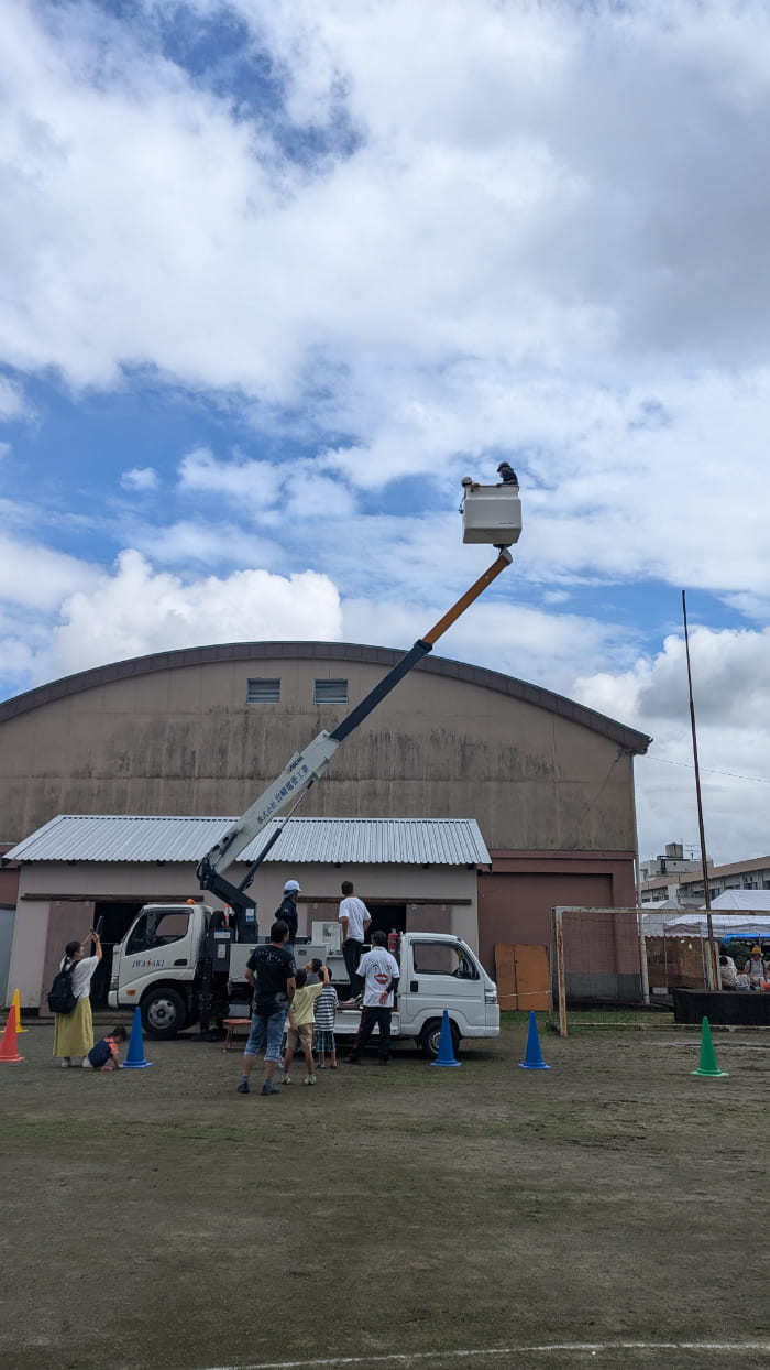 ヘルメットをしっかり装着して、プロのスタッフと一緒に作業車に乗り込むと、子どもたちはまるで空を飛ぶように、ぐんぐんと高い空へと上がっていきます。
