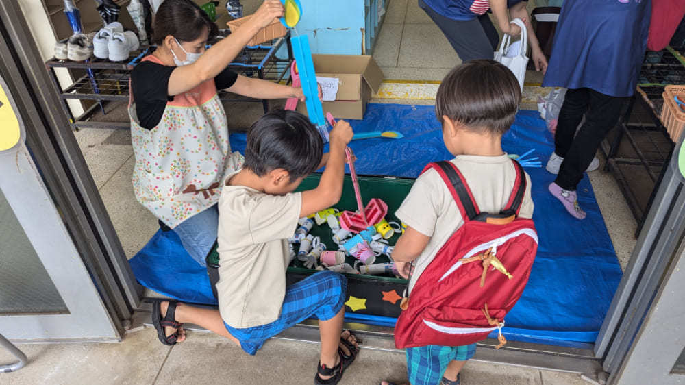 ブースには、手作りのクレーンゲームが登場。紙コップで作られたおもちゃを景品にしたこのゲームは、子どもたちに大人気!