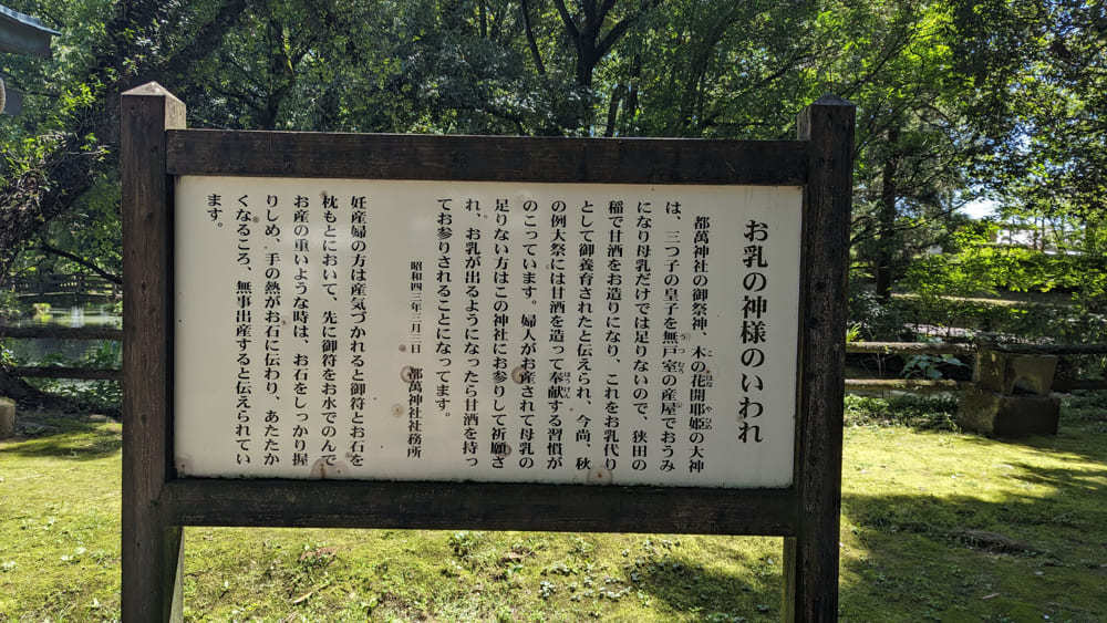 祭神であるコノハナサクヤヒメは三人の御子を育てるのに、母乳では足りなかったため甘酒を造り三人の御子を育てたと伝えられています。