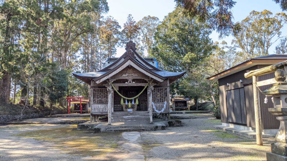 西都原古墳の1キロ南に位置する三宅神社。ニニギノミコトはこの三宅神社周辺に笠狭の宮(かさのみや)という御殿を建て、中つ国を治めていたと云われています。