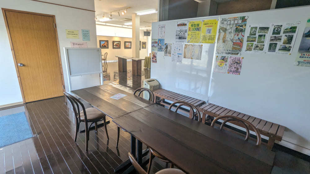 ギャラリーの奥には憩いのスペースがあり、ここで交流が生まれるそうです。展示の主催者の方が在廊しているときは直接お話をきくこともでいます。