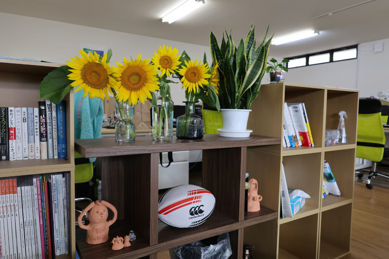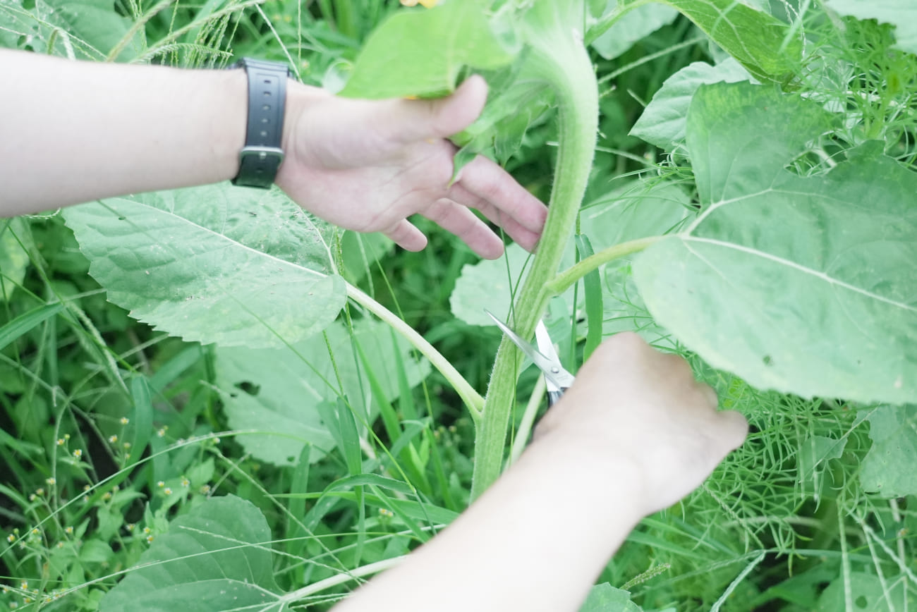 今回摘み取りして持ち帰らせていただいたひまわりは職場の休憩スペースに飾りました。一気に職場が華やかになり、見ているだけで癒しの効果がありますね。