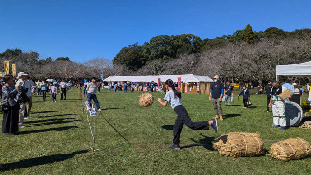 鬼の俵投げでは、重さのある俵を遠くへ投げる力強さが試され、参加者たちは力を振り絞って挑戦しました。