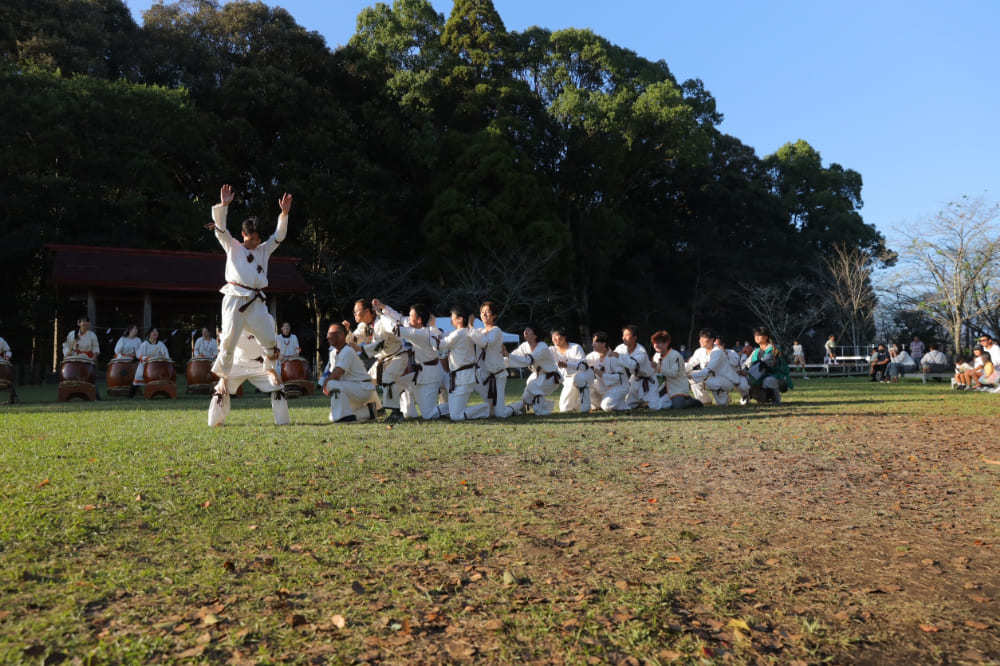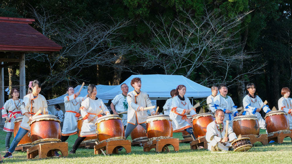 西都古墳太鼓保存会のメンバーによる演奏は、西都原古墳群に力強く響き渡りました。