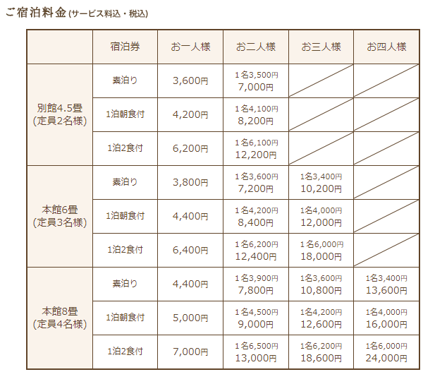 また、宿泊料金もとてもリーズナブル!詳細は下記の料金表をご覧ください。