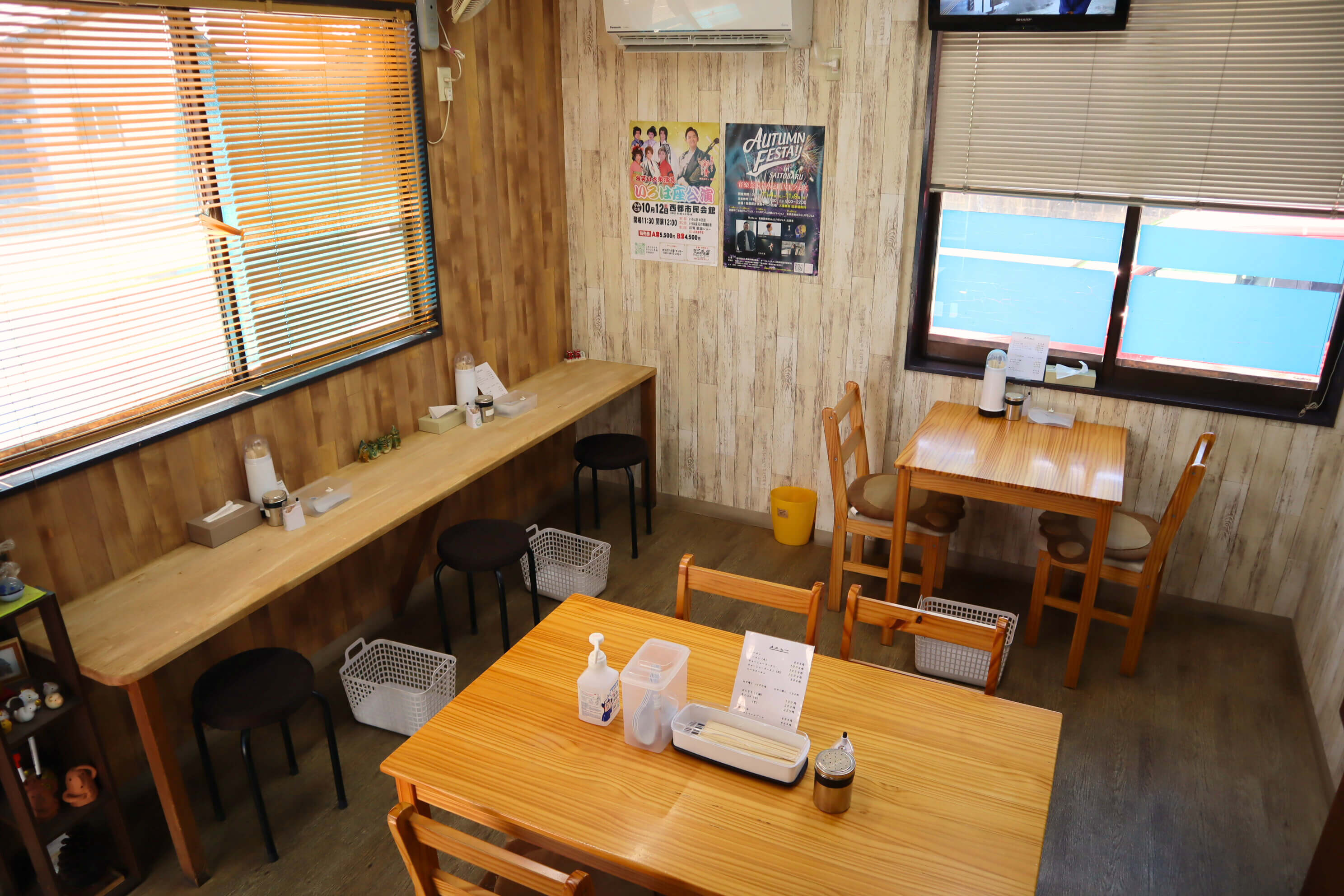 店内は2人掛けと4人掛けのテーブル席がそれぞれ1つ。カウンターは3席あり、大人3人が座れる座敷には、ベビーチェアも用意されています。
