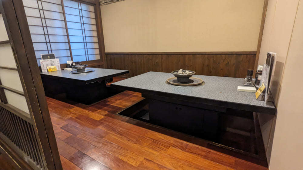 目の前で肉や魚を焼いて食べる楽しさと、旬の刺身を同じテーブルで味わえます。掘りごたつ席とカウンターがあり、ご家族でもお一人でも気兼ねなく過ごせます。